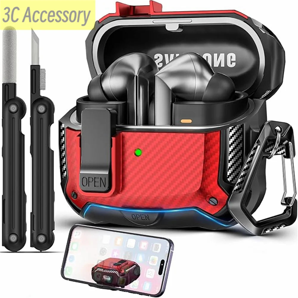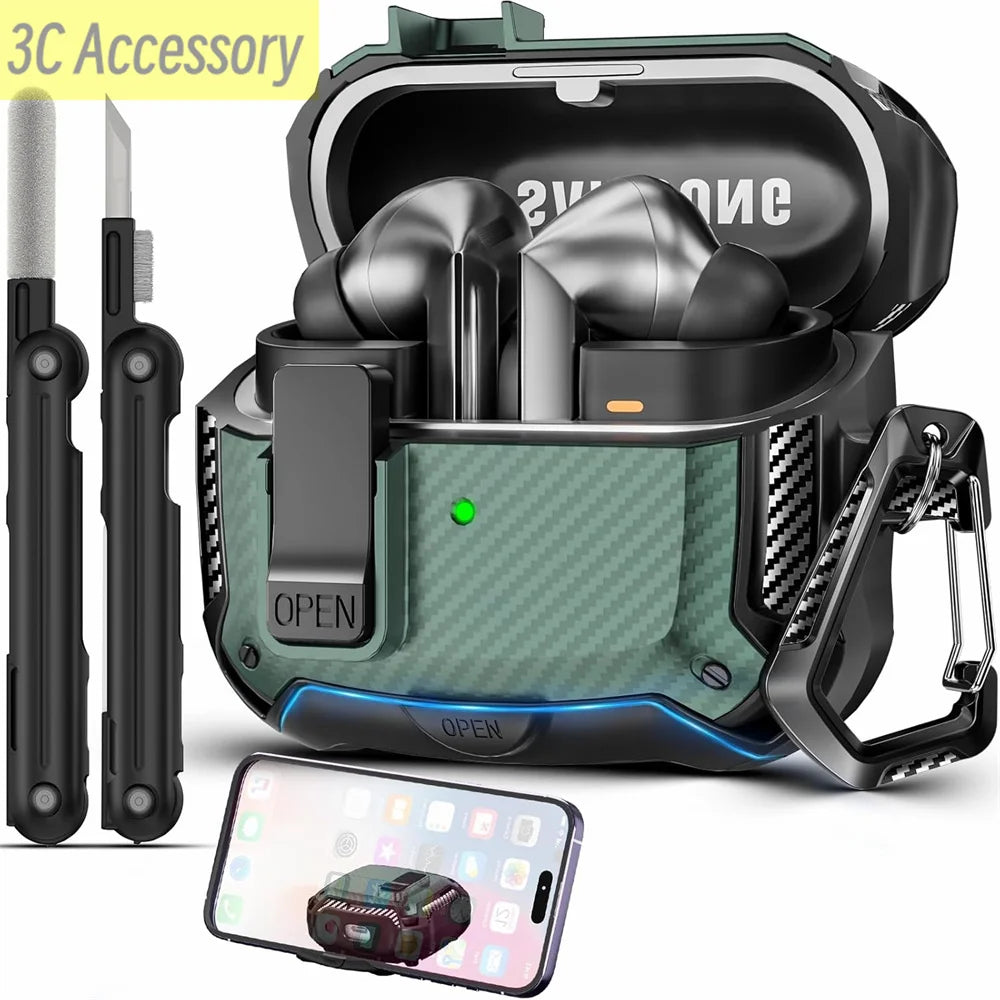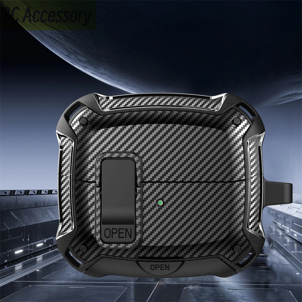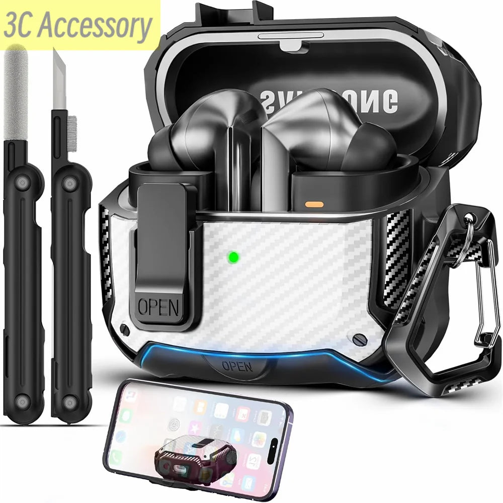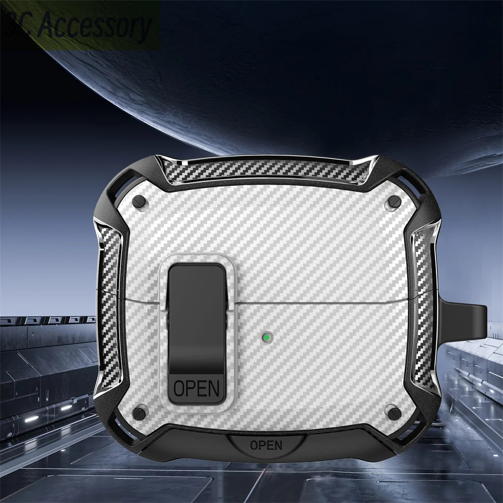 הערכה כוללת נרתיק מוקשח מחומר TPU+PC עם טקסטורת קרבון יוקרתית, עט ניקוי 3 ב‑1 לניקוי יסודי של האוזניות ומחזיק מפתחות איכותי לנשיאה נוחה.